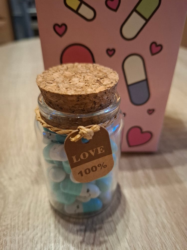 Glass bottle filled with 50 capsules. Each capsule has a little love note in them .