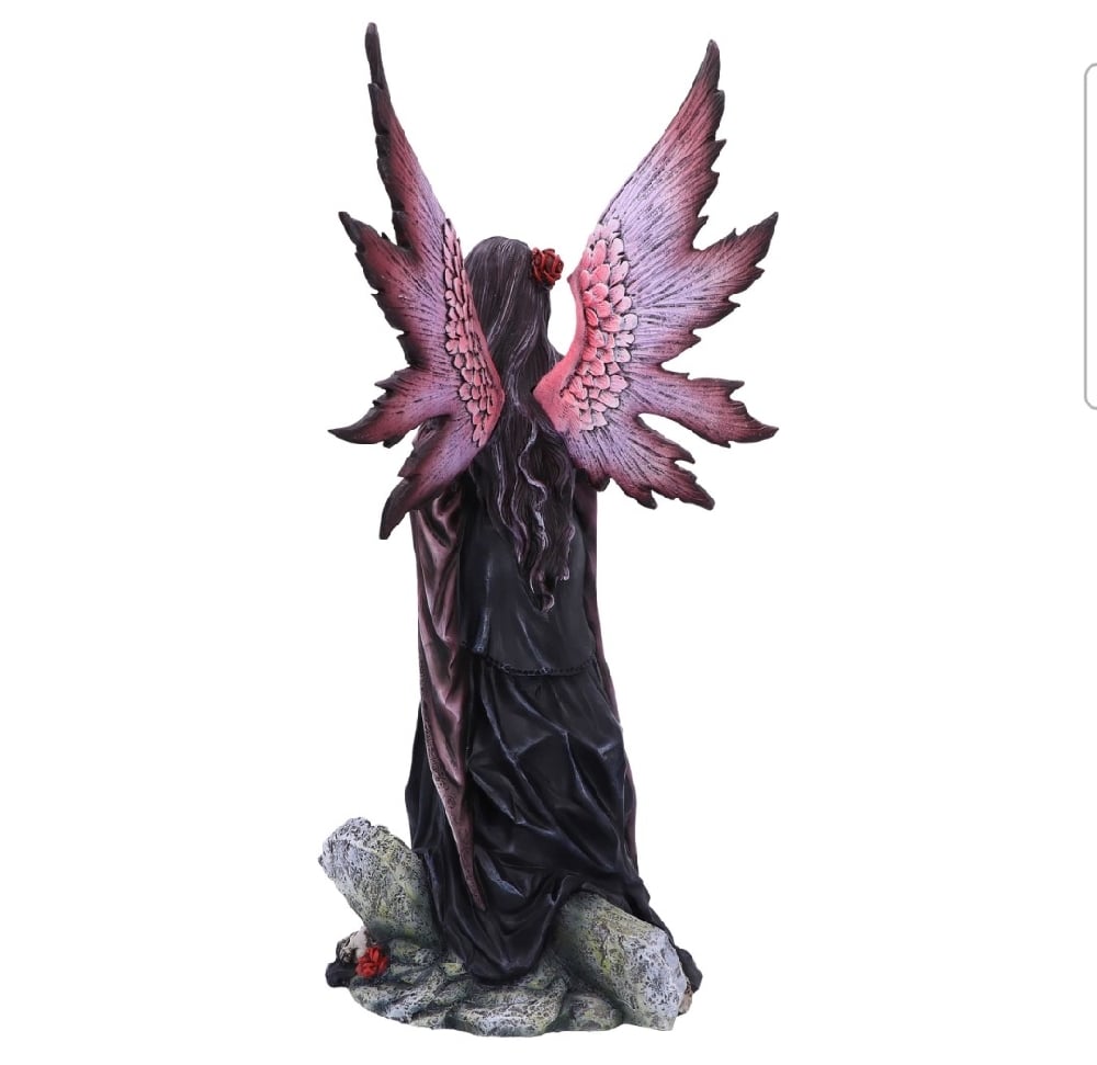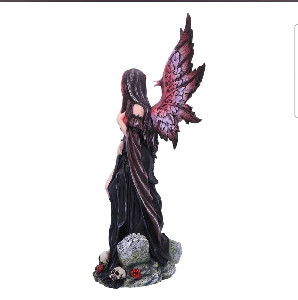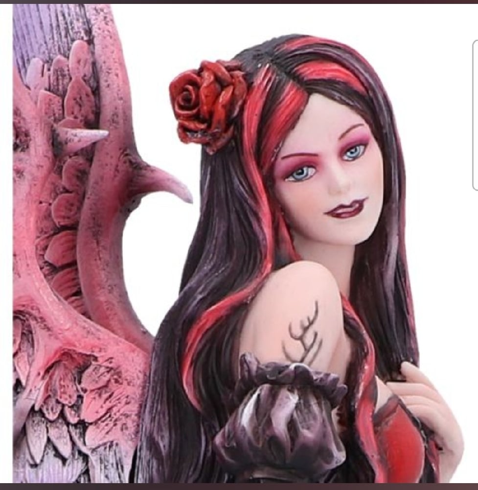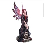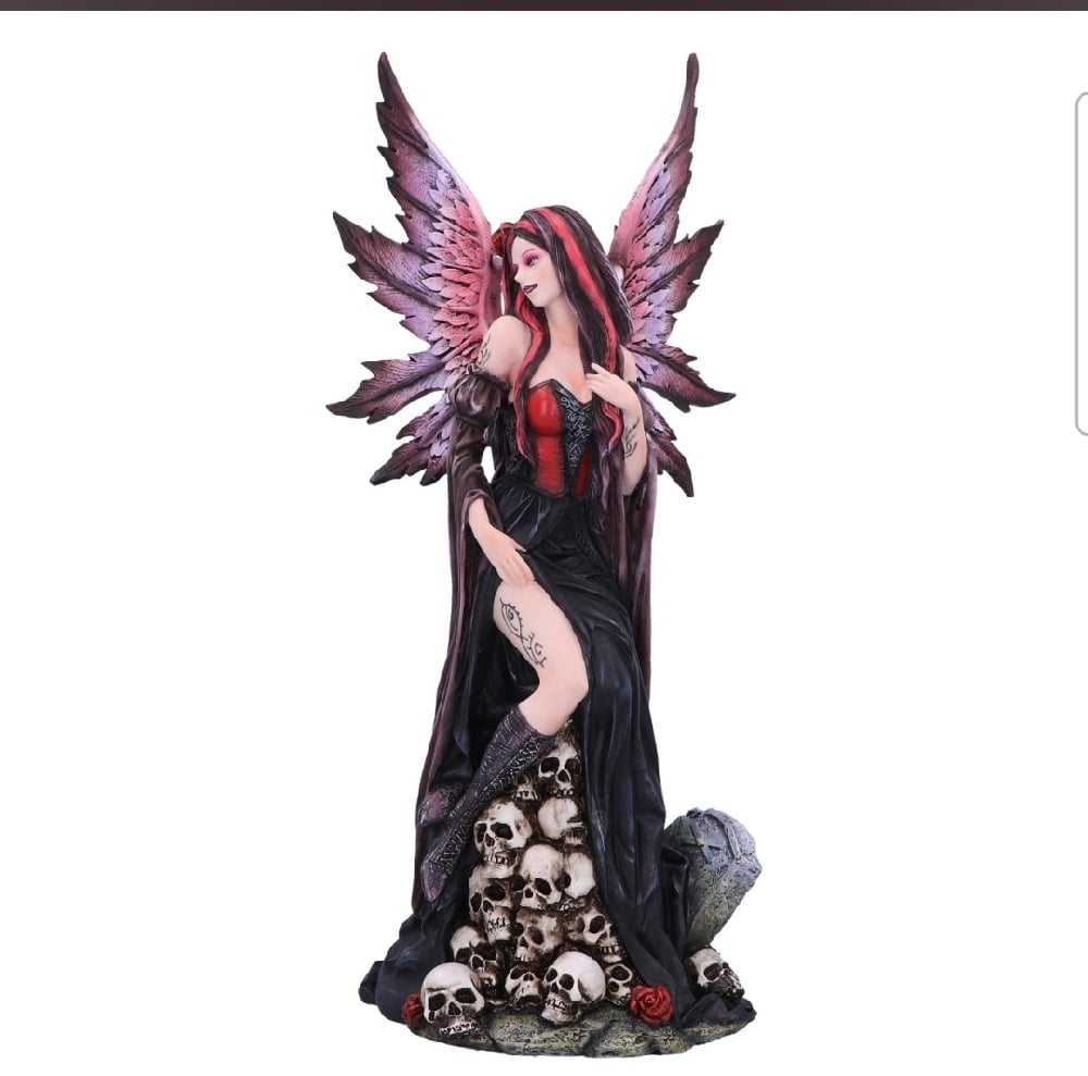 Embrace the dark allure of our Rose Fairy Figurine. Cloaked in captivating black and red attire, she sits upon a pile of skulls, exuding an air of mystique. A daring slit in her dress reveals a tantalizing tattoo, adding an element of intrigue. Cast in the finest resin before being expertly hand-painted, this breathtaking figurine is the perfect piece for fantasy and fairy lovers
