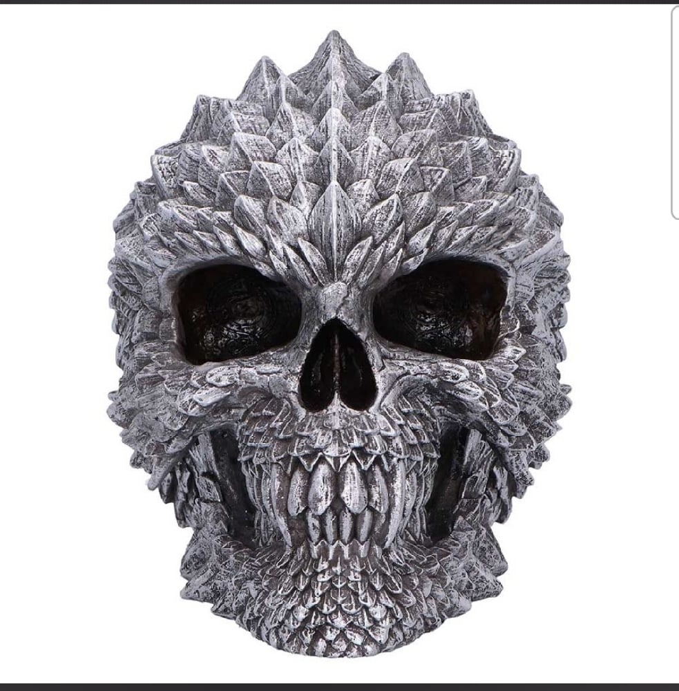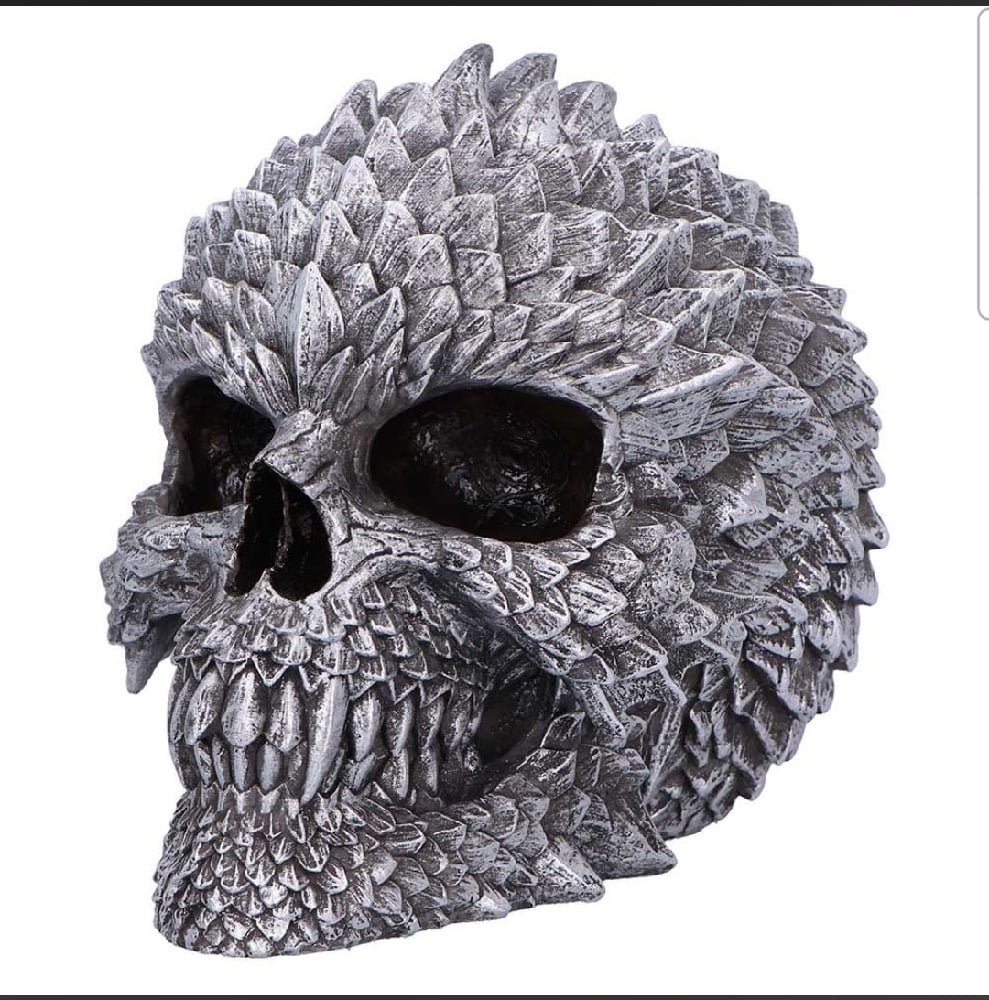 Scaled remains, a captivating skull figurine from the renowned fantasy and gothic giftware brand, Nemesis Now. This piece offers a darkly enchanting aesthetic that blends gothic themes with mythical fantasy, making it an eye-catching addition to any themed collection. Ideal for gift shops, alternative boutiques, or fantasy-themed retailers. Bring a dramatic edge to any display.