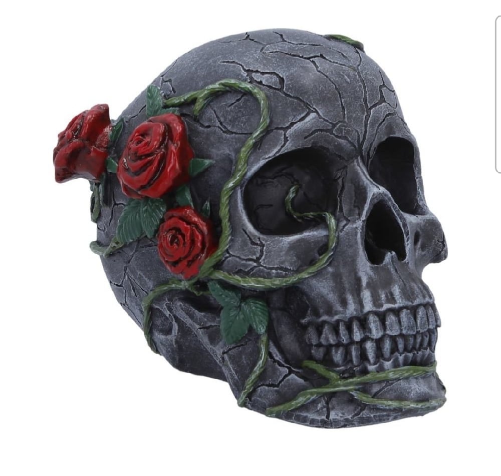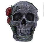 Expertly crafted resin construction and hand-painted finishes that bring out the rich tones of the skull, contrasted by vibrant red roses and finely detailed vine- like patterns. This attention to detail creates a visually captivating piece that appeals to collectors and decor enthusiasts alike.