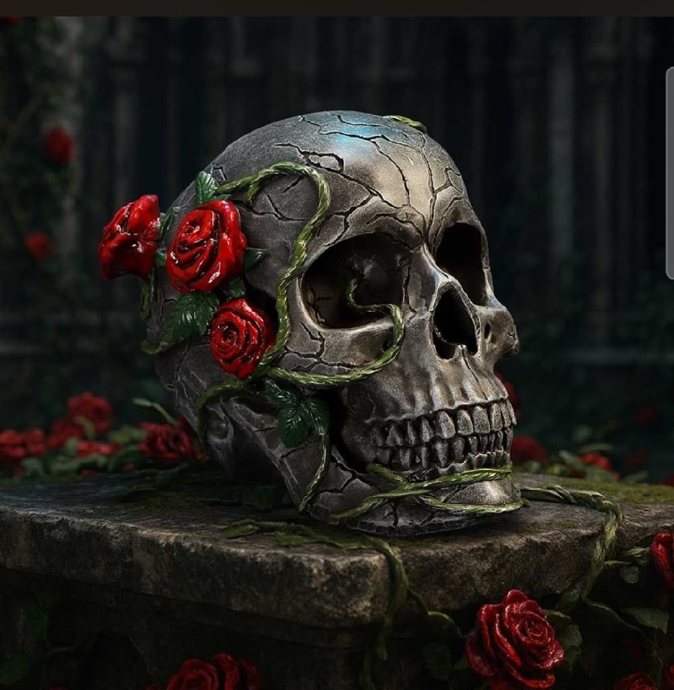 A beautifully crafted Twilight Bloom Skull Figurine, combining gothic artistry with romantic floral elements. This striking black skull adorned with red roses and delicate vine details offers a unique blend of dark elegance and intricate design, perfect for alternative decor collections.