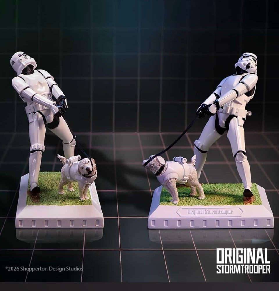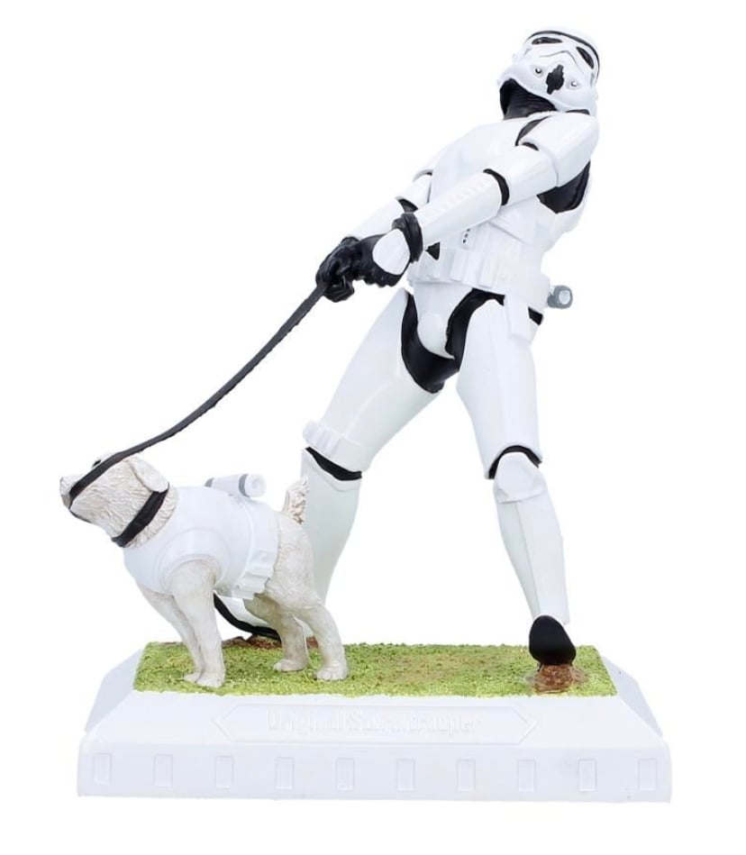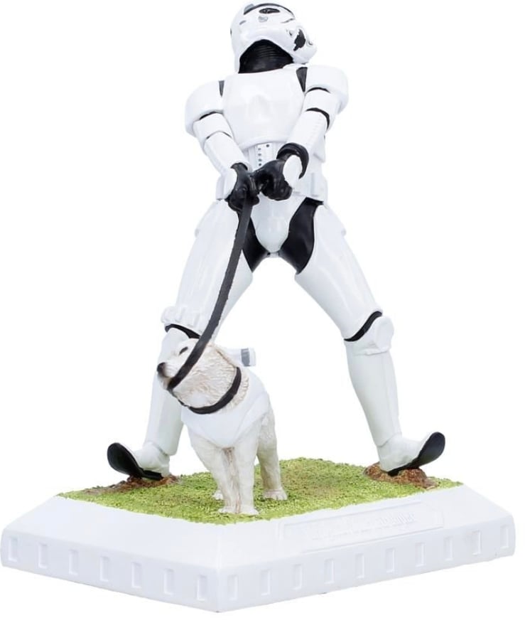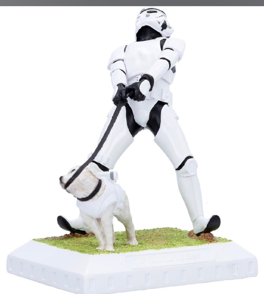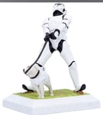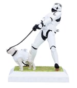 A humorous and imaginative figurine that captures a comical moment between a Stormtrooper and his defiant, four-legged companion. In a delightful twist, the armoured dog holds the leash in its mouth while the trooper strains to regain control.
